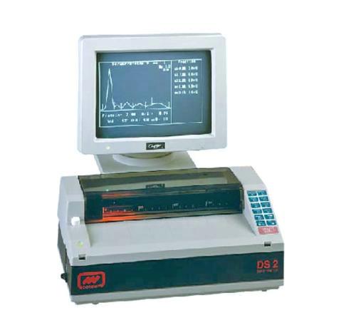 Денситометр DS-2, управляемый микропроцессором, с монитором и принтером. Предназначен для автоматического денситометрирования окрашенных фракций, разделенных на прозрачной и непрозрачной основе.