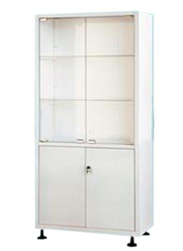 Шкаф медицинский ШМ 2.102 Выполнен из стали толщиной 0,8 мм. Сварная конструкция. Покрытие полимерно-порошковой краской. Установлен на регулируемые ножки. Верхняя секция с дверцами и двумя полками из стекла. Нижняя с запирающимися дверцами и полкой из стали.