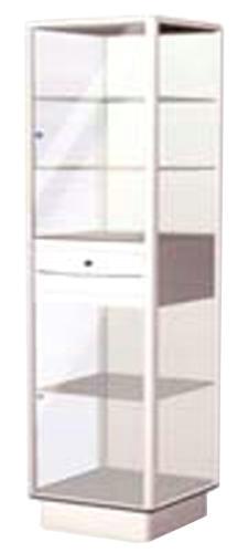 Сборный каркас шкафа выполнен из цельнометаллического профиля с порошковым покрытием наружных и внутренних поверхностей. Боковые стенки, створки и полки — стеклянные. Трехсекционный шкаф имеет выдвижной металлический ящик с замком.
