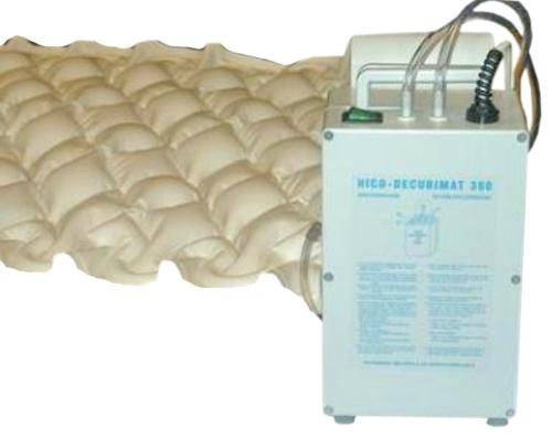 Антипролежневый матрац HICO-DECUBIMAT 367 состоит из винилового мата, с меняющимся давлением, а также насоса, который работает без шума и вибраций. Прибор устойчив и был проверен на практике. Эта система воздушного потока уникальна. Через очень маленькие дырочки в мате происходит выход воздуха, что снижает потливость пациента и улучшает микроклимат кожи. Так как эти дырочки подобны вентилятору, они предотвращают поступление воздуха или влаги извне. Прибор не обязательно устанавливать на полу, он снабжен подвешивающим устройством, что облегчает транспортировку больного.